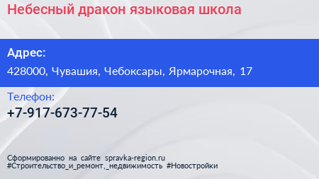 Небесный дракон, языковая школа по адресу 428000, Чувашия, Чебоксары, Ярмарочная, 17 в дальнейшем Организация, размещена в следующих категориях: