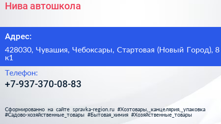Нива, автошкола по адресу 428030, Чувашия, Чебоксары, Стартовая (Новый Город), 8 к1 в дальнейшем Организация, размещена в следующих категориях: