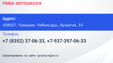 Нива, автошкола по адресу 428027, Чувашия, Чебоксары, Хузангая, 14 в дальнейшем Организация, размещена в следующих категориях:
