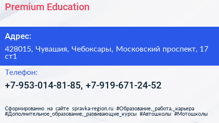 Premium Education по адресу 428015, Чувашия, Чебоксары, Московский проспект, 17 ст1 в дальнейшем Организация, размещена в следующих категориях: