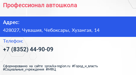Профессионал, автошкола по адресу 428027, Чувашия, Чебоксары, Хузангая, 14 в дальнейшем Организация, размещена в следующих категориях: