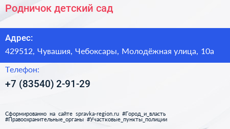 Родничок, детский сад по адресу 429512, Чувашия, Чебоксары, Молодёжная улица, 10а в дальнейшем Организация, размещена в следующих категориях: