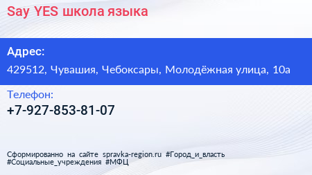 Say YES, школа языка по адресу 429512, Чувашия, Чебоксары, Молодёжная улица, 10а в дальнейшем Организация, размещена в следующих категориях: