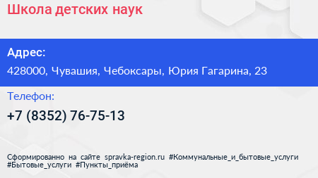 Школа детских наук по адресу 428000, Чувашия, Чебоксары, Юрия Гагарина, 23 в дальнейшем Организация, размещена в следующих категориях: