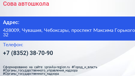 Сова, автошкола по адресу 428009, Чувашия, Чебоксары, проспект Максима Горького, 32 в дальнейшем Организация, размещена в следующих категориях: