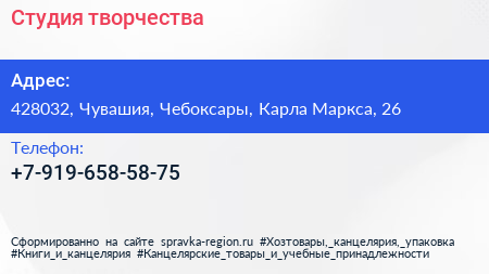 Студия творчества по адресу 428032, Чувашия, Чебоксары, Карла Маркса, 26 в дальнейшем Организация, размещена в следующих категориях: