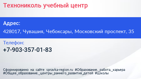 Технониколь, учебный центр по адресу 428017, Чувашия, Чебоксары, Московский проспект, 35 в дальнейшем Организация, размещена в следующих категориях: