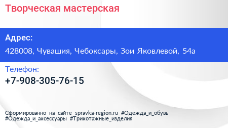 Творческая мастерская по адресу 428008, Чувашия, Чебоксары, Зои Яковлевой, 54а в дальнейшем Организация, размещена в следующих категориях: