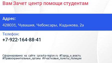 Вам Зачет, центр помощи студентам по адресу 428031, Чувашия, Чебоксары, Кадыкова, 2а в дальнейшем Организация, размещена в следующих категориях: