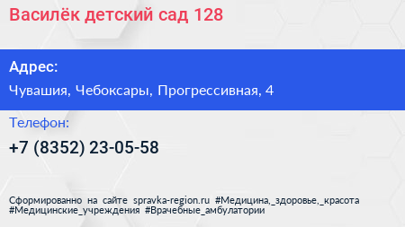 Василёк, детский сад №128 по адресу Чувашия, Чебоксары, Прогрессивная, 4 в дальнейшем Организация, размещена в следующих категориях: