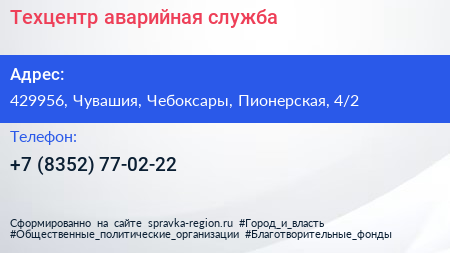 Техцентр, аварийная служба по адресу 429956, Чувашия, Чебоксары, Пионерская, 4/2 в дальнейшем Организация, размещена в следующих категориях: