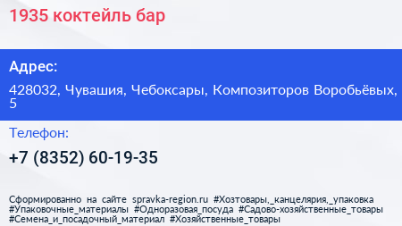 1935, коктейль-бар по адресу 428032, Чувашия, Чебоксары, Композиторов Воробьёвых, 5 в дальнейшем Организация, размещена в следующих категориях: