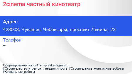 2cinema, частный кинотеатр по адресу 428003, Чувашия, Чебоксары, проспект Ленина, 23 в дальнейшем Организация, размещена в следующих категориях: