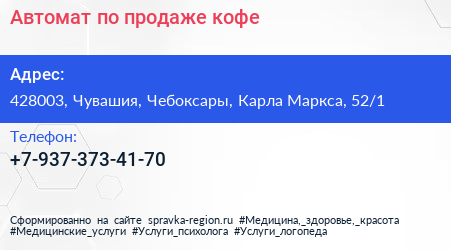 Автомат по продаже кофе по адресу 428003, Чувашия, Чебоксары, Карла Маркса, 52/1 в дальнейшем Организация, размещена в следующих категориях: