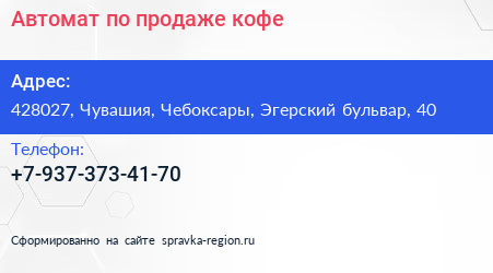 Автомат по продаже кофе по адресу 428027, Чувашия, Чебоксары, Эгерский бульвар, 40 в дальнейшем Организация, размещена в следующих категориях: