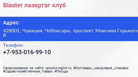 Blaster, лазертаг-клуб по адресу 428001, Чувашия, Чебоксары, проспект Максима Горького, 8 в дальнейшем Организация, размещена в следующих категориях: