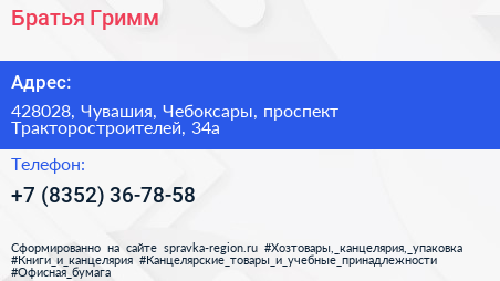 Братья Гримм по адресу 428028, Чувашия, Чебоксары, проспект Тракторостроителей, 34а в дальнейшем Организация, размещена в следующих категориях:
