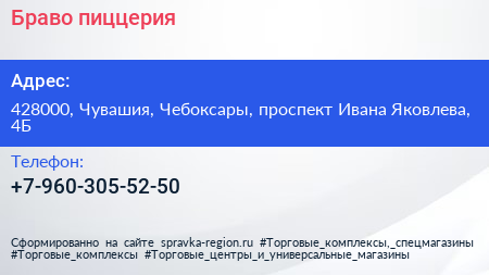 Браво, пиццерия по адресу 428000, Чувашия, Чебоксары, проспект Ивана Яковлева, 4Б в дальнейшем Организация, размещена в следующих категориях: