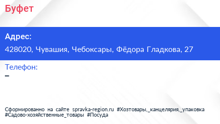Буфет по адресу 428020, Чувашия, Чебоксары, Фёдора Гладкова, 27 в дальнейшем Организация, размещена в следующих категориях: