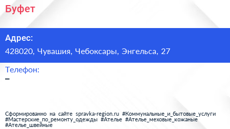 Буфет по адресу 428020, Чувашия, Чебоксары, Энгельса, 27 в дальнейшем Организация, размещена в следующих категориях:
