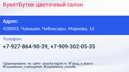 БукетБутик, цветочный салон по адресу 428003, Чувашия, Чебоксары, Маркова, 16 в дальнейшем Организация, размещена в следующих категориях: