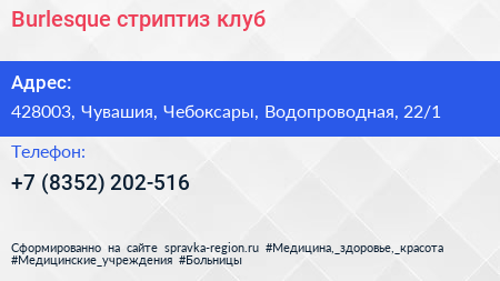 Burlesque, стриптиз-клуб по адресу 428003, Чувашия, Чебоксары, Водопроводная, 22/1 в дальнейшем Организация, размещена в следующих категориях: