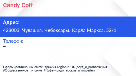 Candy & Coff по адресу 428003, Чувашия, Чебоксары, Карла Маркса, 52/1 в дальнейшем Организация, размещена в следующих категориях: