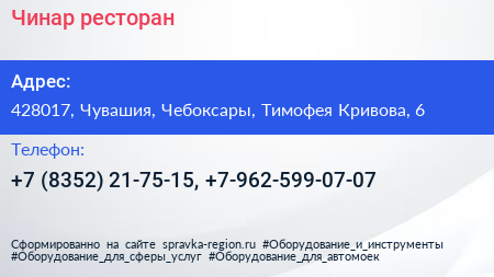 Чинар, ресторан по адресу 428017, Чувашия, Чебоксары, Тимофея Кривова, 6 в дальнейшем Организация, размещена в следующих категориях: