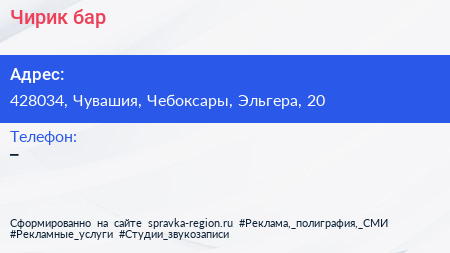 Чирик, бар по адресу 428034, Чувашия, Чебоксары, Эльгера, 20 в дальнейшем Организация, размещена в следующих категориях: