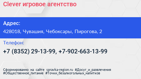 Clever, игровое агентство по адресу 428018, Чувашия, Чебоксары, Пирогова, 2 в дальнейшем Организация, размещена в следующих категориях: