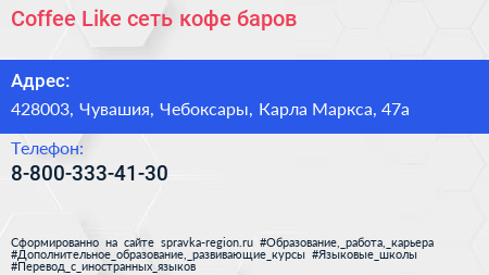 Coffee Like, сеть кофе-баров по адресу 428003, Чувашия, Чебоксары, Карла Маркса, 47а в дальнейшем Организация, размещена в следующих категориях: