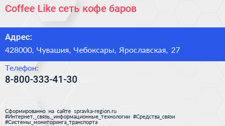 Coffee Like, сеть кофе-баров по адресу 428000, Чувашия, Чебоксары, Ярославская, 27 в дальнейшем Организация, размещена в следующих категориях: