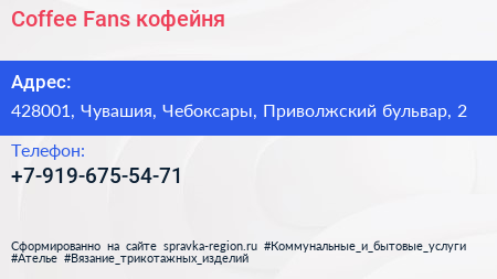 Coffee.Fans, кофейня по адресу 428001, Чувашия, Чебоксары, Приволжский бульвар, 2 в дальнейшем Организация, размещена в следующих категориях: