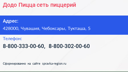 Додо Пицца, сеть пиццерий по адресу 428000, Чувашия, Чебоксары, Тукташа, 5 в дальнейшем Организация, размещена в следующих категориях: