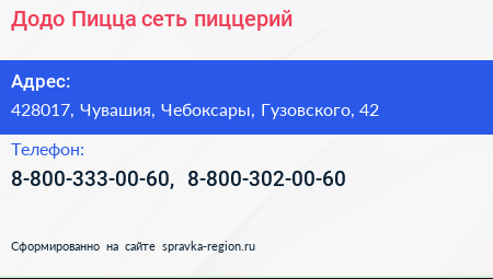 Додо Пицца, сеть пиццерий по адресу 428017, Чувашия, Чебоксары, Гузовского, 42 в дальнейшем Организация, размещена в следующих категориях: