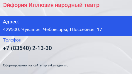 Эйфория-Иллюзия, народный театр по адресу 429500, Чувашия, Чебоксары, Шоссейная, 17 в дальнейшем Организация, размещена в следующих категориях: