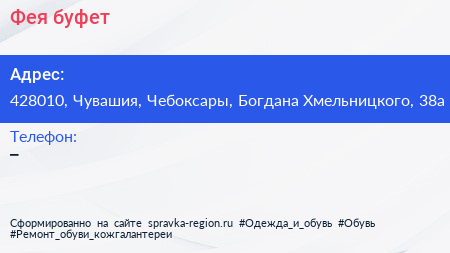 Фея, буфет по адресу 428010, Чувашия, Чебоксары, Богдана Хмельницкого, 38а в дальнейшем Организация, размещена в следующих категориях: