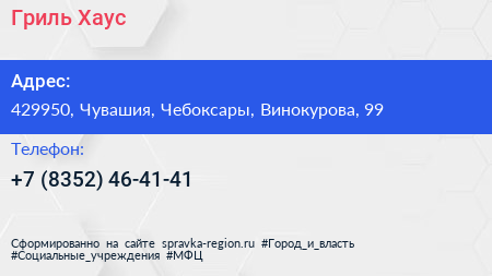 Гриль Хаус по адресу 429950, Чувашия, Чебоксары, Винокурова, 99 в дальнейшем Организация, размещена в следующих категориях: