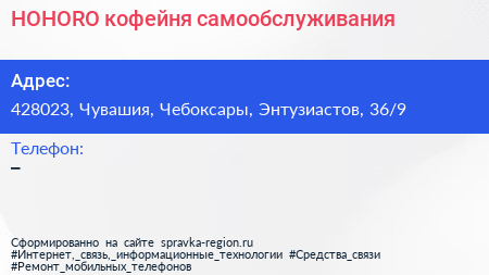 HOHORO, кофейня самообслуживания по адресу 428023, Чувашия, Чебоксары, Энтузиастов, 36/9 в дальнейшем Организация, размещена в следующих категориях: