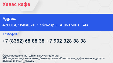Хавас, кафе по адресу 428014, Чувашия, Чебоксары, Ашмарина, 54а в дальнейшем Организация, размещена в следующих категориях: