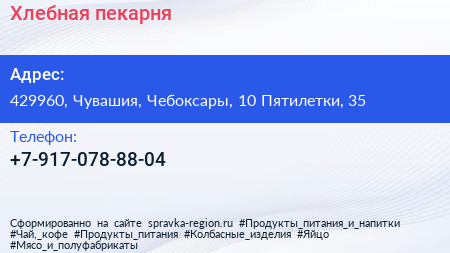 Хлебная, пекарня по адресу 429960, Чувашия, Чебоксары, 10 Пятилетки, 35 в дальнейшем Организация, размещена в следующих категориях: