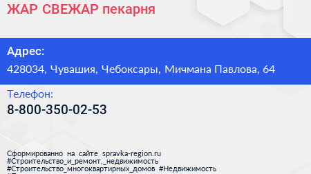 ЖАР СВЕЖАР, пекарня по адресу 428034, Чувашия, Чебоксары, Мичмана Павлова, 64 в дальнейшем Организация, размещена в следующих категориях: