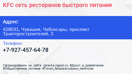 KFC, сеть ресторанов быстрого питания по адресу 428031, Чувашия, Чебоксары, проспект Тракторостроителей, 3 в дальнейшем Организация, размещена в следующих категориях: