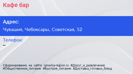Кафе-бар по адресу Чувашия, Чебоксары, Советская, 52 в дальнейшем Организация, размещена в следующих категориях: