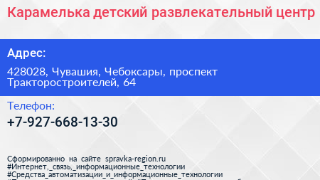 Карамелька, детский развлекательный центр по адресу 428028, Чувашия, Чебоксары, проспект Тракторостроителей, 64 в дальнейшем Организация, размещена в следующих категориях: