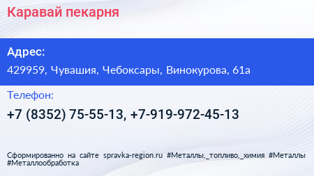 Каравай, пекарня по адресу 429959, Чувашия, Чебоксары, Винокурова, 61а в дальнейшем Организация, размещена в следующих категориях:
