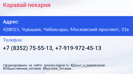 Каравай, пекарня по адресу 428015, Чувашия, Чебоксары, Московский проспект, 31в в дальнейшем Организация, размещена в следующих категориях: