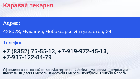 Каравай, пекарня по адресу 428023, Чувашия, Чебоксары, Энтузиастов, 24 в дальнейшем Организация, размещена в следующих категориях: