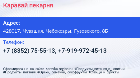 Каравай, пекарня по адресу 428017, Чувашия, Чебоксары, Гузовского, 8Б в дальнейшем Организация, размещена в следующих категориях: