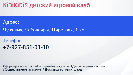 KiDiKiDiS, детский игровой клуб по адресу Чувашия, Чебоксары, Пирогова, 1 к6 в дальнейшем Организация, размещена в следующих категориях: